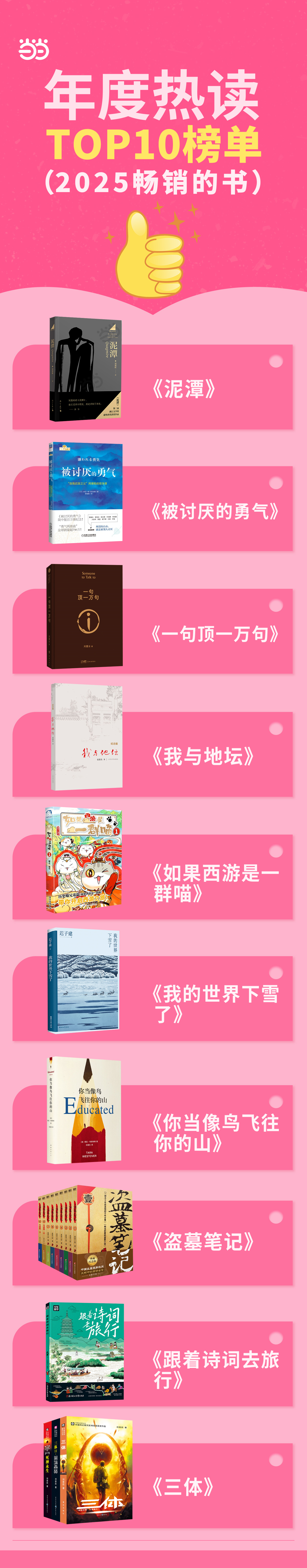 世界读书日来临之际,4月21日,封面新闻联合当当网,基于图书平台的阅读消费大数据,为大家推荐全年书单!书单盘点了在过去的2025年,有哪些值得推荐的好书,大众的关注度又聚焦在哪些领域,带“全民”一起“悦读”,封面新闻还将联合当当网为封面粉丝送出阅读平台周卡福利(文末抽奖)。